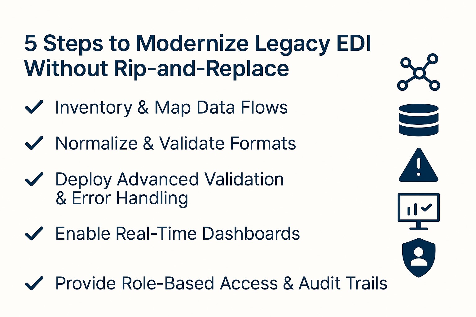 - Phased Go-Live – Roll out in manageable waves (e.g., one trading partner or file type at a time), with constant monitoring and error alerting.